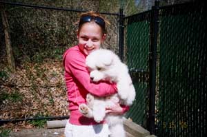 Panda continues, at 10 years of age, to share herself, her beauty, her love, and her calming presence with others. Panda's latest accomplishment, and no small one at that, is welcoming Angel, a seven and a half month old Samoyed puppy, who in the words of my daughter "chews on life."